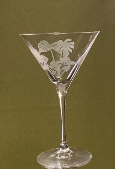 Retro Martini Glass Monstera Etched Glassware Gift Set Mid Century Cocktail Glassware Tropical Etched Martini Barware Martini Lover Gift
