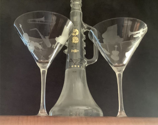 Music Lover Martini glasses Jazz Gift Set of 2 Cocktail Etched Glasses engraved Musical Instruments, Musician Housewarming Gift 10 ounce.