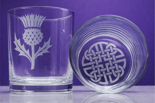 Scottish Thistle Whiskey Glass with Hand Etched Celtic Knot – Scotch Whisky Tumbler, Scottish Heritage Barware, Gift for Whisky Lovers