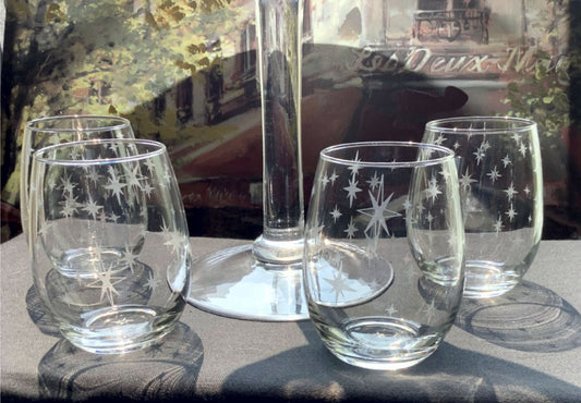 Mid Century Starburst Etched Stemless Wine Glasses Wine Lover Gift Set of 4 Retro Glassware Atomic Era Wine Glass Tumbler